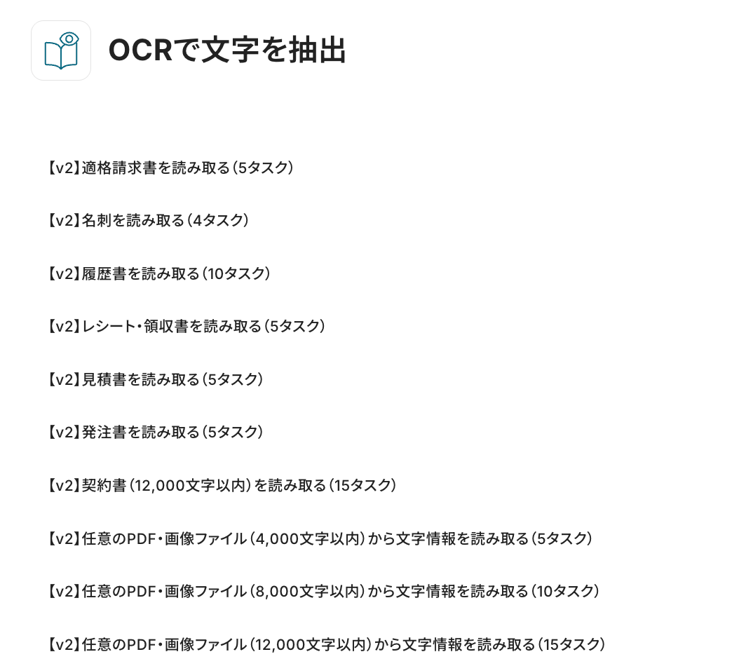 1.アクションの選択 アクションは下図の中から選択できるので、フローを活用する業務内容に合わせて選択してください。 ちなみに今回使用しているテンプレートでは、「【v2】任意のPDF・画像ファイル(4,000文字以内)から文字情報を読み取る(5タスク)」がデフォルトで設定されていますよ!