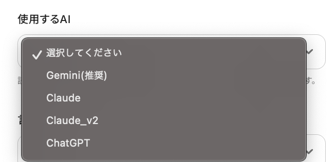4.使用するAI テキスト抽出に使用するAIモデルを設定します。 下図の中から選択できるので、お好みで設定してみてくださいね! デフォルトでGemini(推奨)が設定されているので、特にこだわりがなければ設定は不要です。