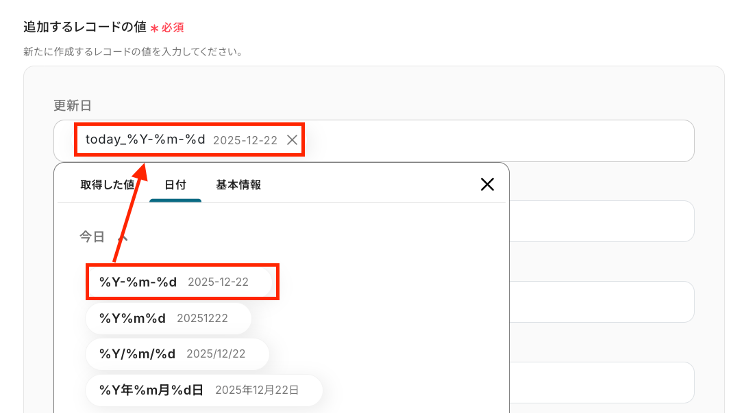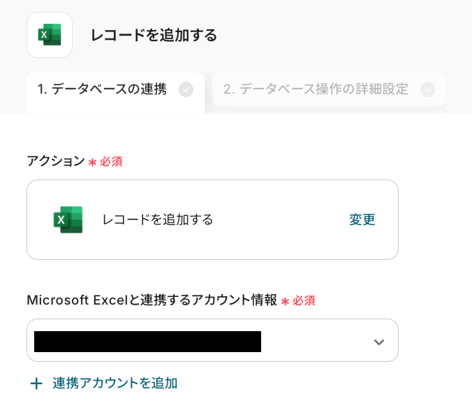 「追加するレコードの値」の各項目は、データベースの連携設定時に連携したMicrosoft Excelの内容に紐づいて表示されています。 項目を修正したい場合はMicrosoft Excel側を修正し、再度連携するようにしてください。 また、「取得した値」を使わずに直接値を入力した場合、フローが起動する度に同じ値が繰り返し追加されてしまうため、ご注意ください。