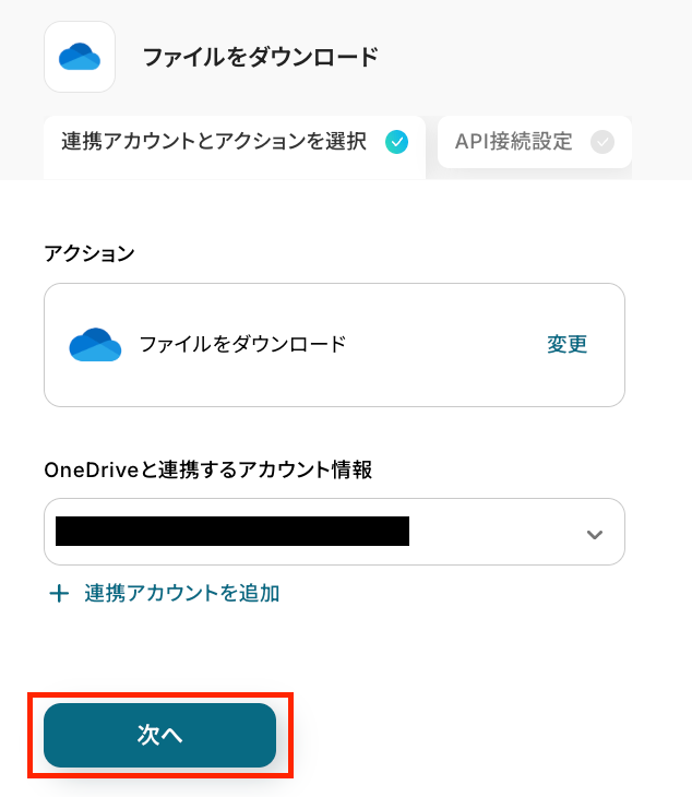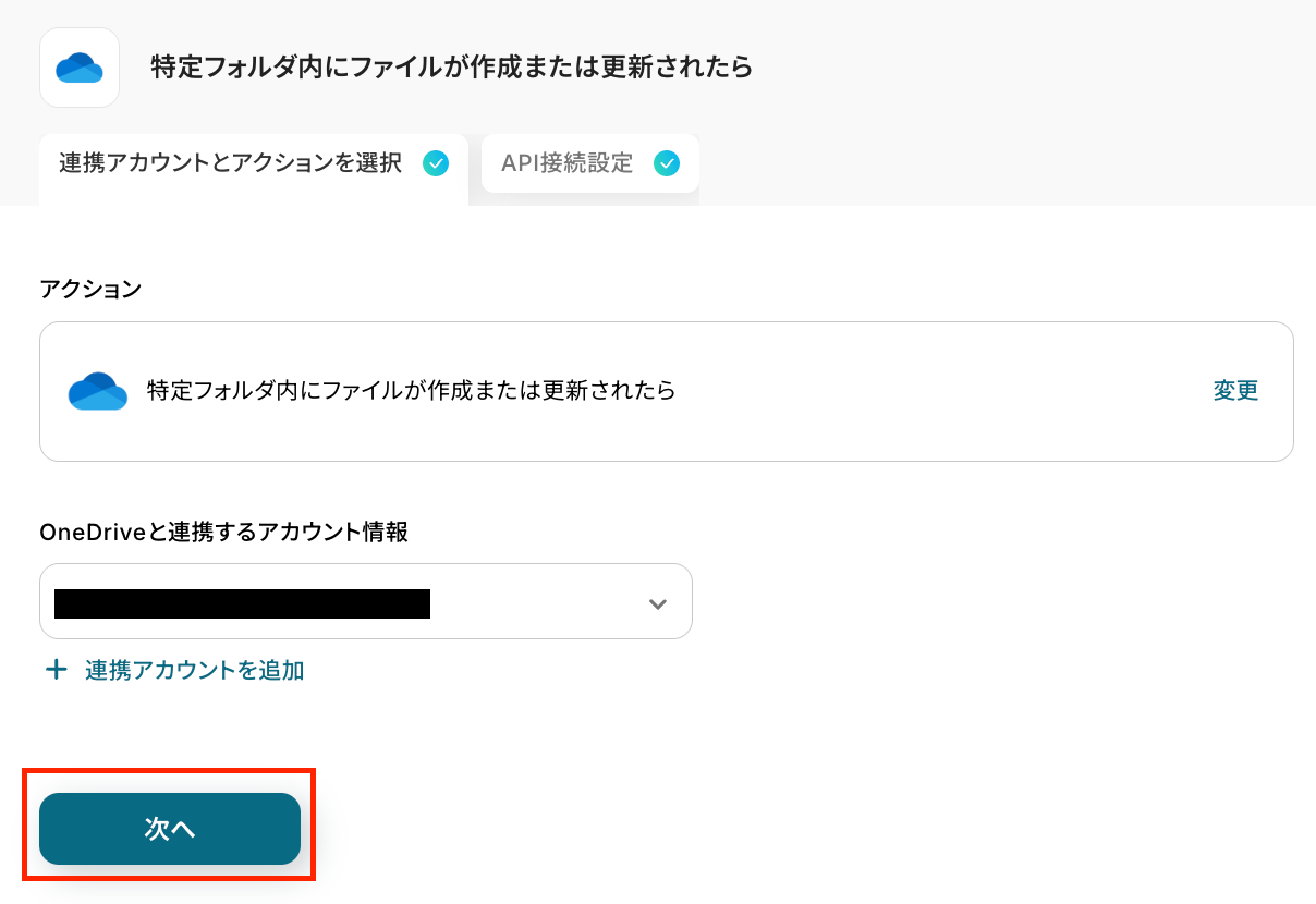 ステップ3と同じ要領で、連携するOneDriveアカウントと、実行するアクションの設定内容を確認し、「次へ」を押しましょう。