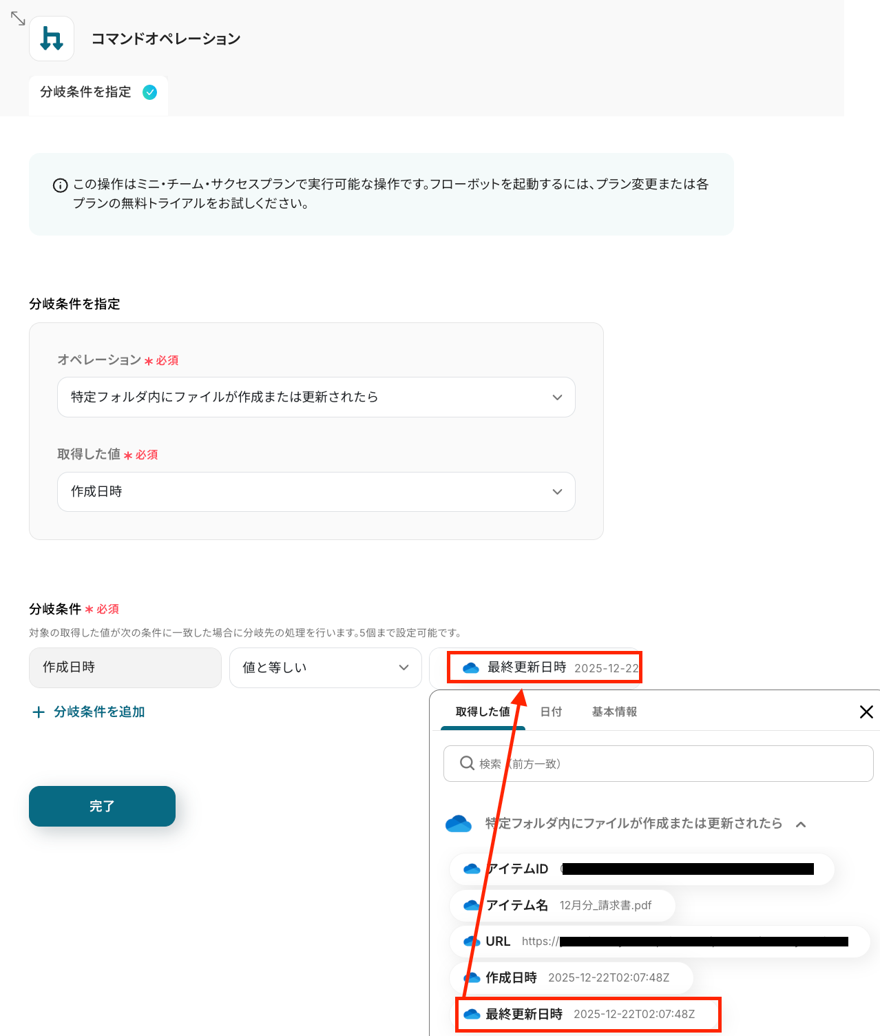 (設定内容は、ステップ3でOneDriveから取得した値のうち、「作成日時」と「最終更新日時」の値が同一であることを、後続のアクションへ進む条件として設定されています。) 設定内容を確認したら「完了」を押して、次のステップに進みます。