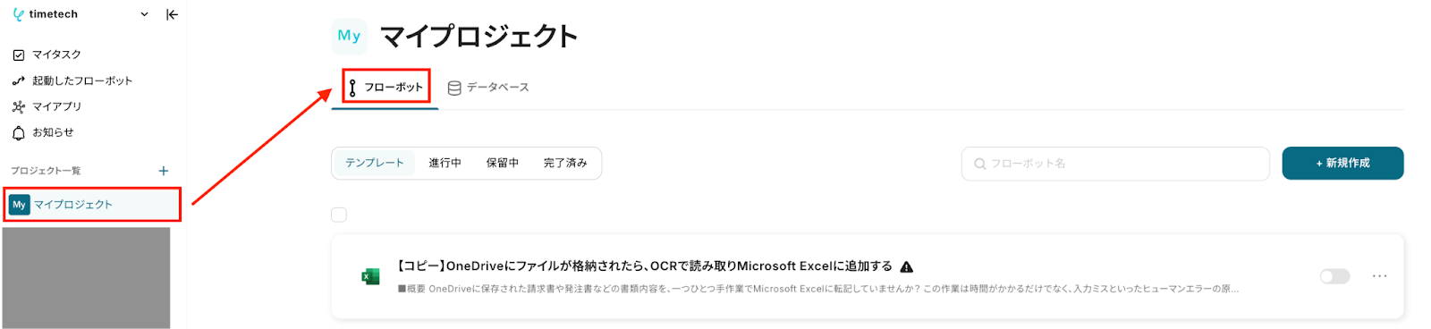 Yoomの画面左側にあるメニュー欄から「マイプロジェクト」にアクセスし、「フローボット」を選択すると、「【コピー】OneDriveにファイルが格納されたら、OCRで読み取りMicrosoft Excelに追加する」という名前で格納されているはずです。