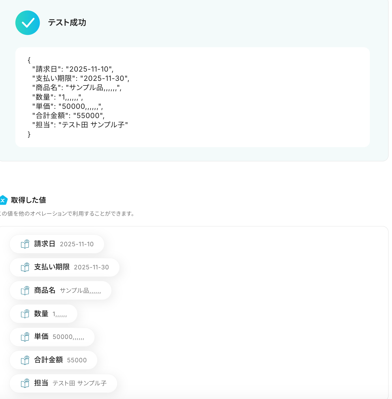 テストに成功すると、取得した値が表示されます。