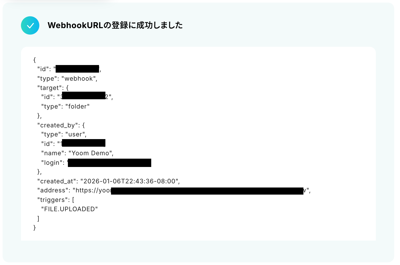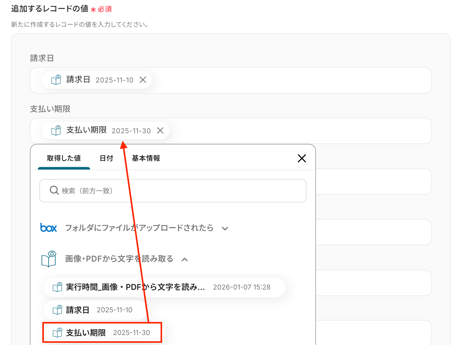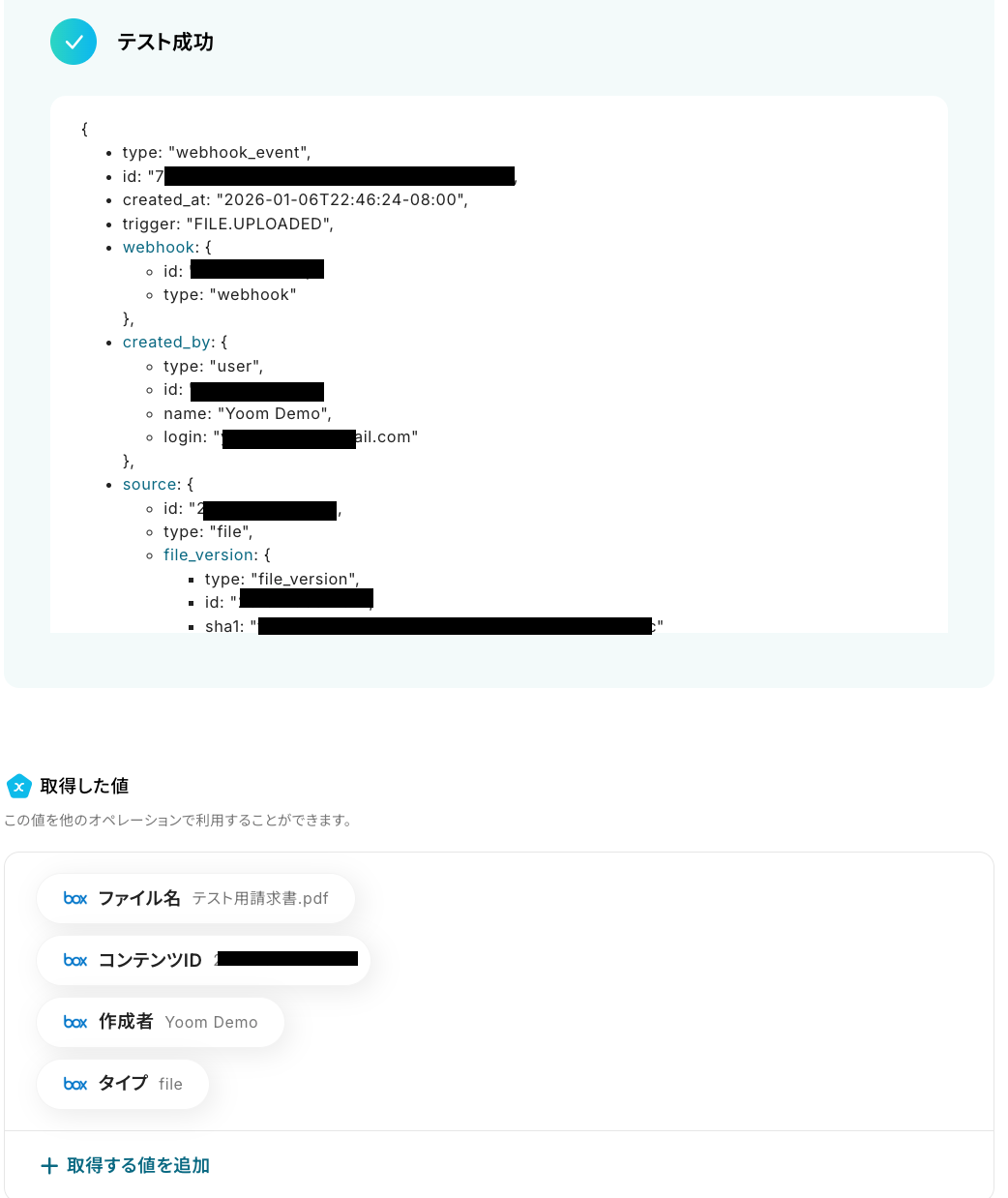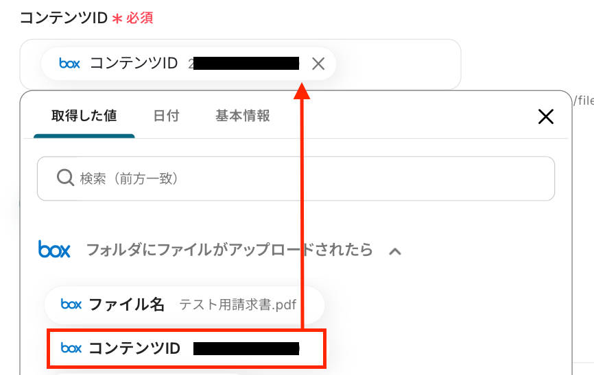 ここでは、Boxのトリガー設定で取得した値を選択してください。