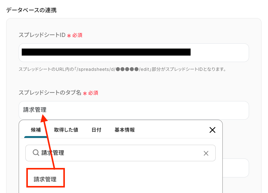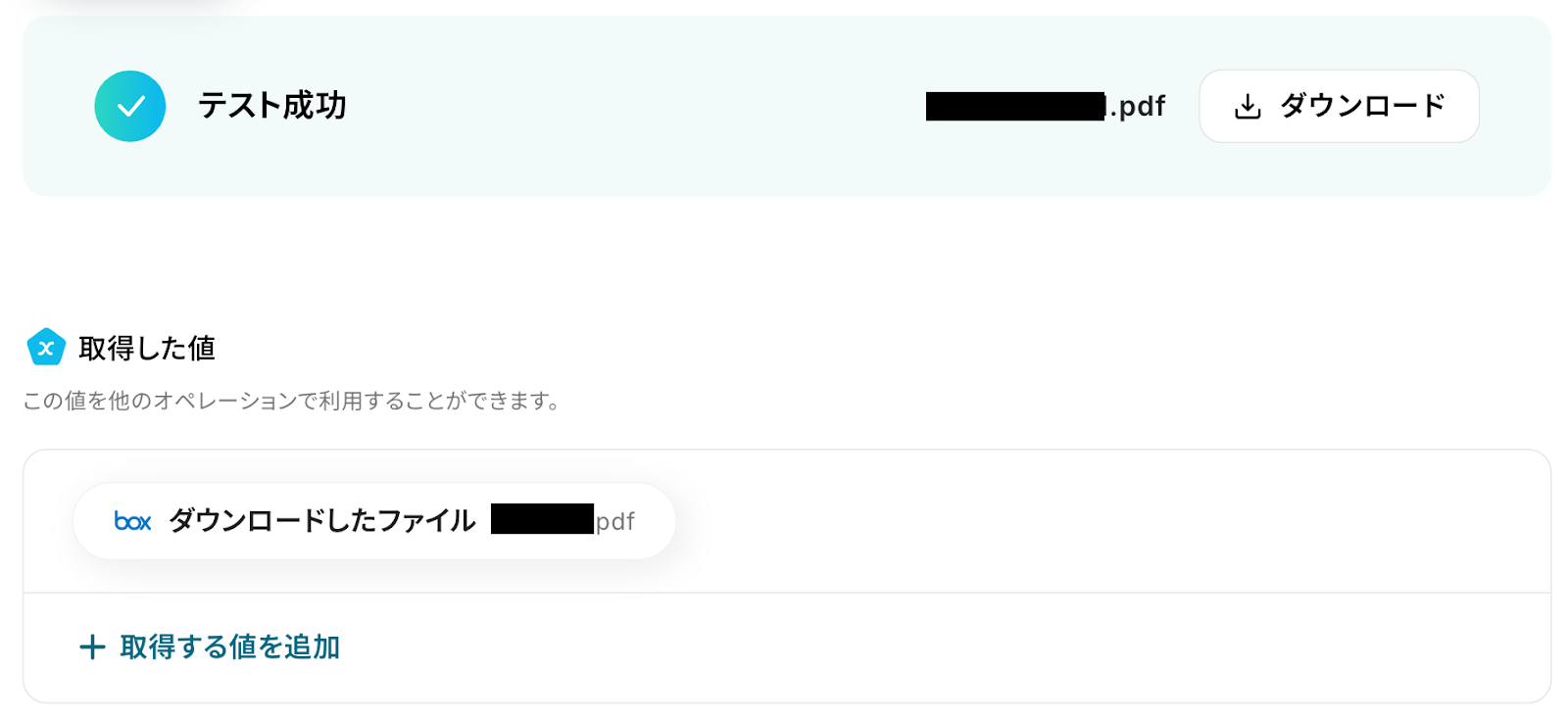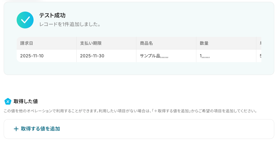 抽出した内容は取得した値として取得でき、この後の設定で使用できます。