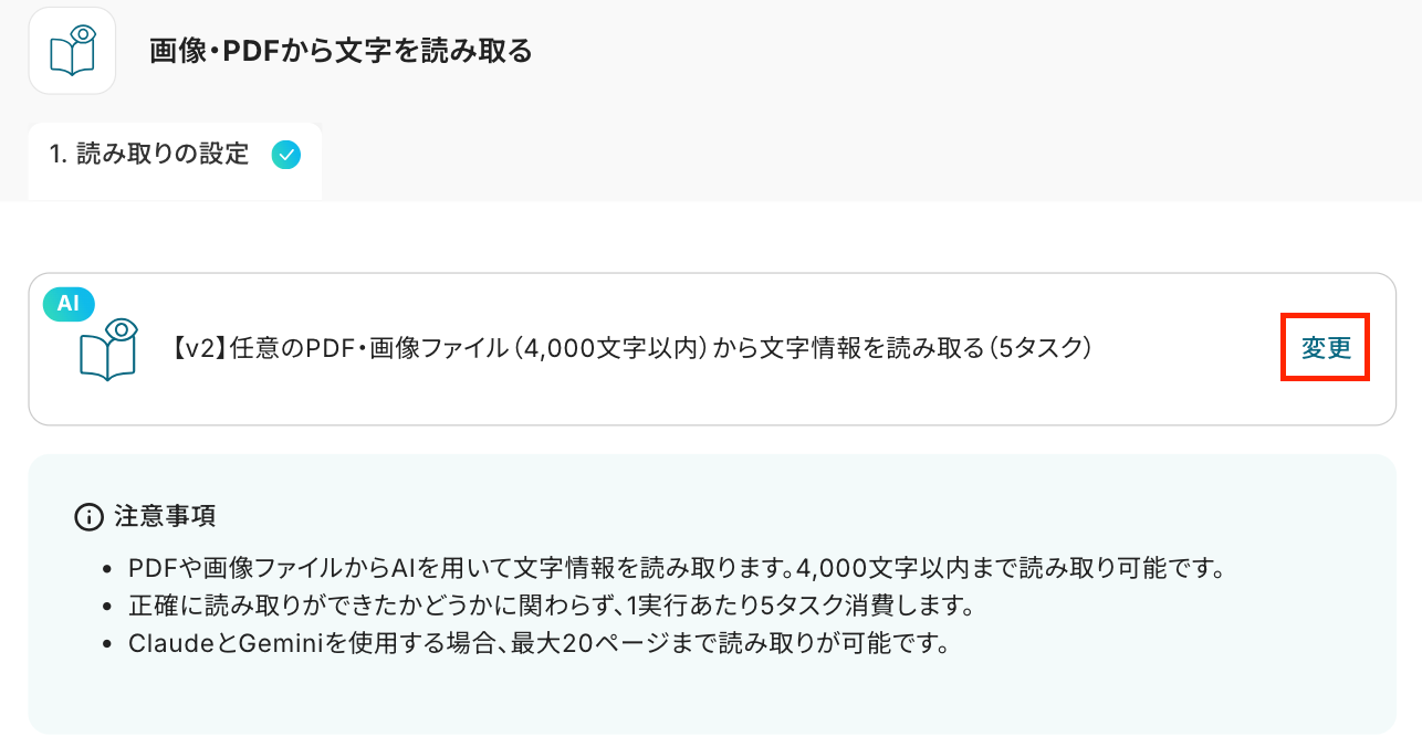 - 次に、オペレーションでAI機能の「画像・PDFから文字を読み取る」を選択し、ダウンロードしたファイルから文字情報を抽出します。