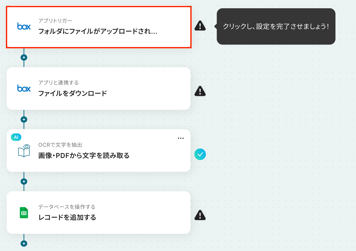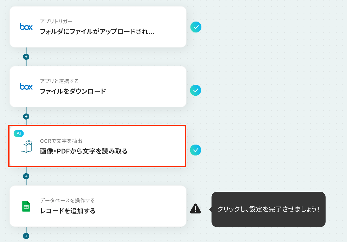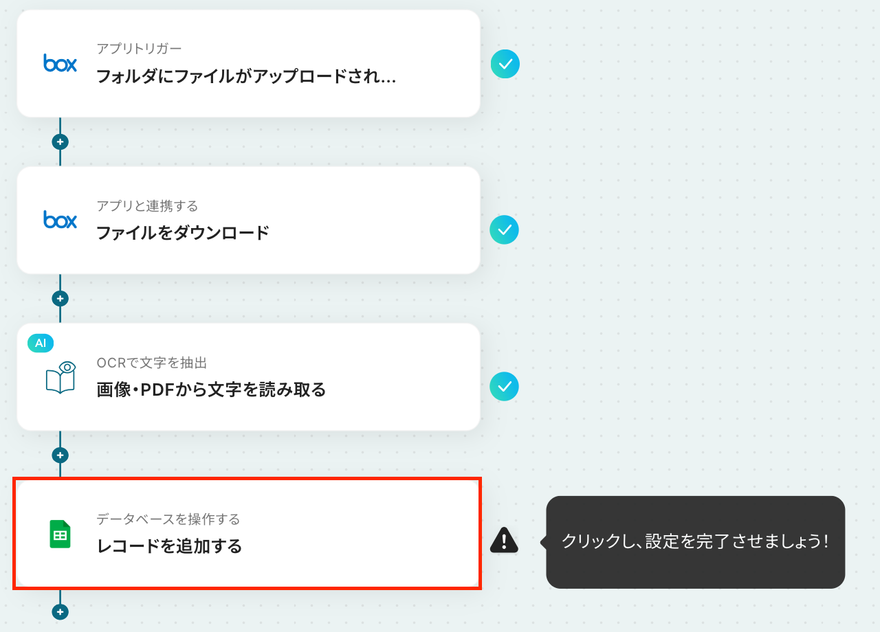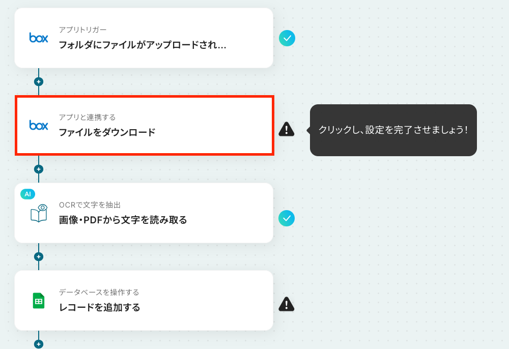 ここから「Boxに格納された文書ファイルをOCRで読み取り、Google スプレッドシートに追加する」フローを設定していきます!