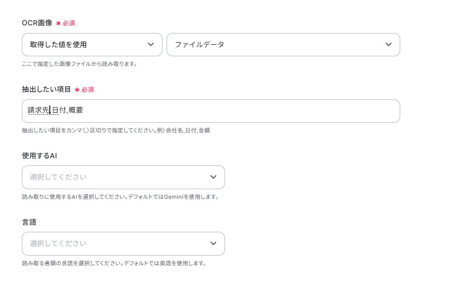 - OCR機能では、抽出したい項目や言語などを任意で設定することができます。