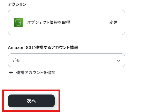 次にAmazon S3でオブジェクト情報を取得します。「オブジェクト情報を取得」をクリックしてください。