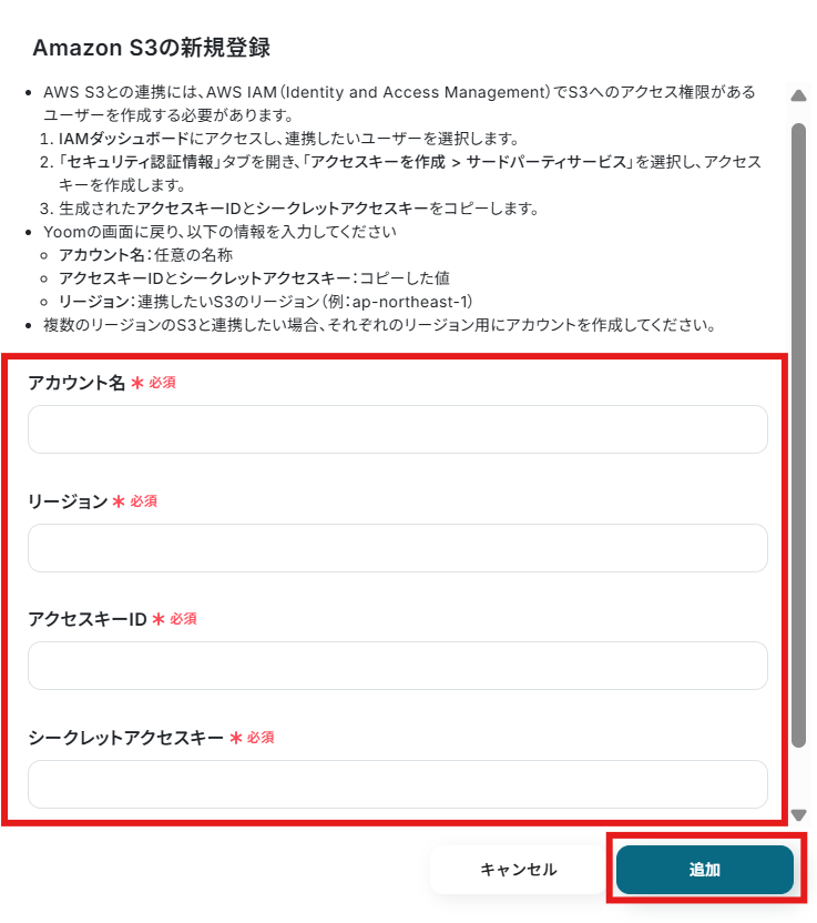 AmazonS3への連携画面が出てきますので、画面に記載の注釈に沿って情報を入力してください。