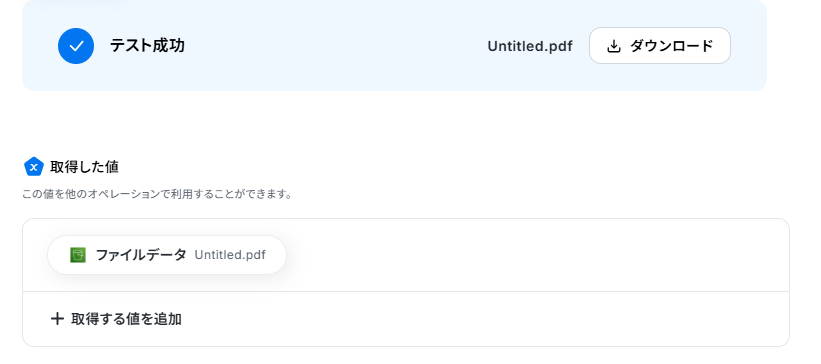 取得した値とは、トリガーやオペレーション設定時に、「テスト」を実行して取得した値のことを指します。