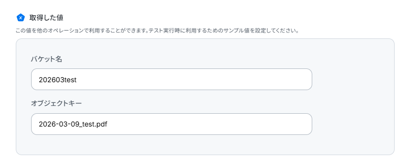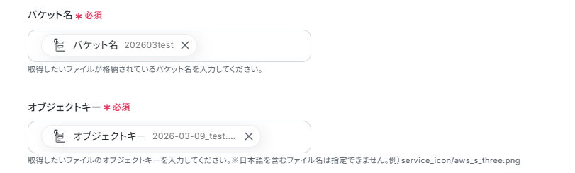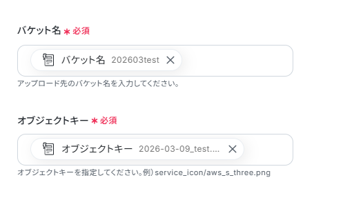 - Amazon S3の「オブジェクトをアップロード」アクションで、ファイルを保存するバケット名とオブジェクトキー(ファイル名)を任意で設定してください