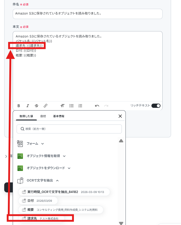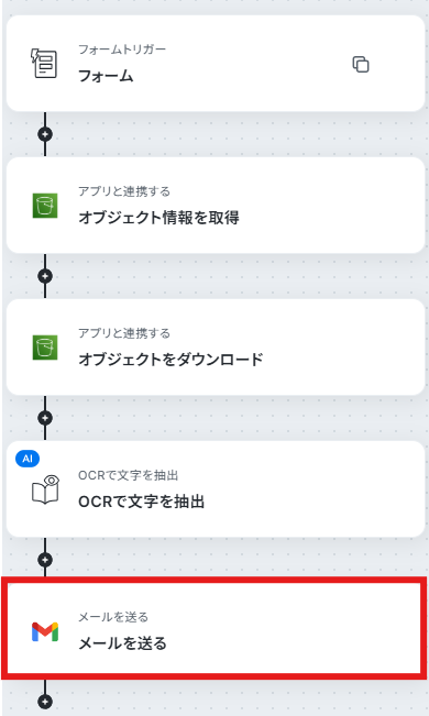 - Gmailで送信するメールの宛先や件名、本文は任意の内容で設定が可能です。本文にはOCR機能で抽出したデータを差し込むことで、通知内容を動的に変更できます