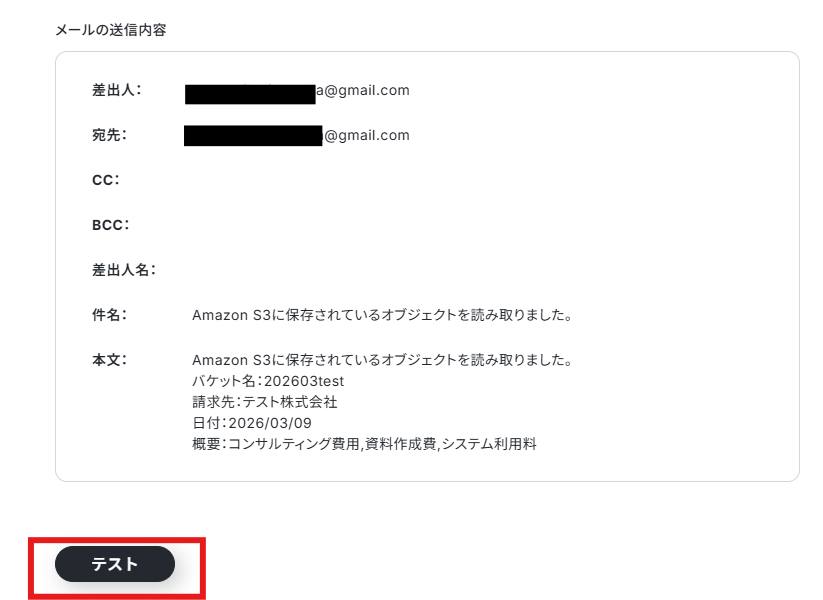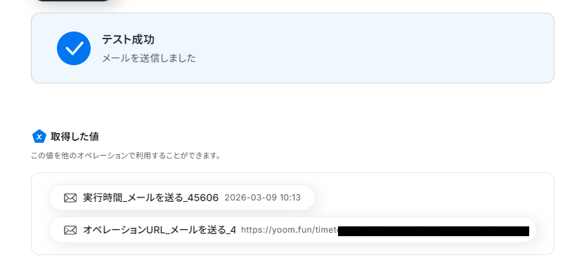 - 最後に、Gmailの「メールを送る」アクションを設定し、抽出したデータを含んだ通知メールを送信します