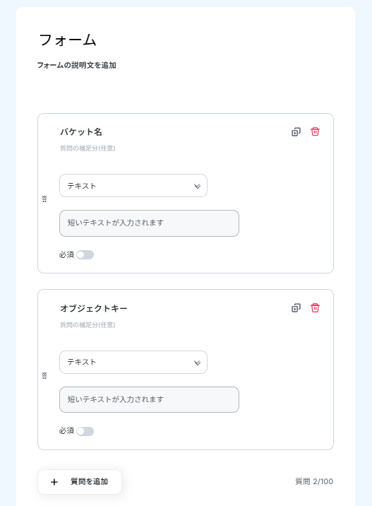 今回はデフォルトで「バケット名」「オブジェクトキー」が入力できるフォームとなっています。質問を追加したい場合は「質問を追加」から行ってください。