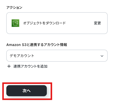 - 続けて、Amazon S3の「オブジェクトをダウンロードする」アクションを設定します