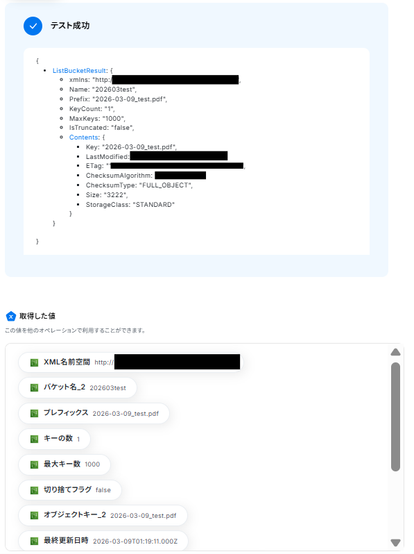バケット名、オブジェクトキーを前ステップで取得した値から入力します。