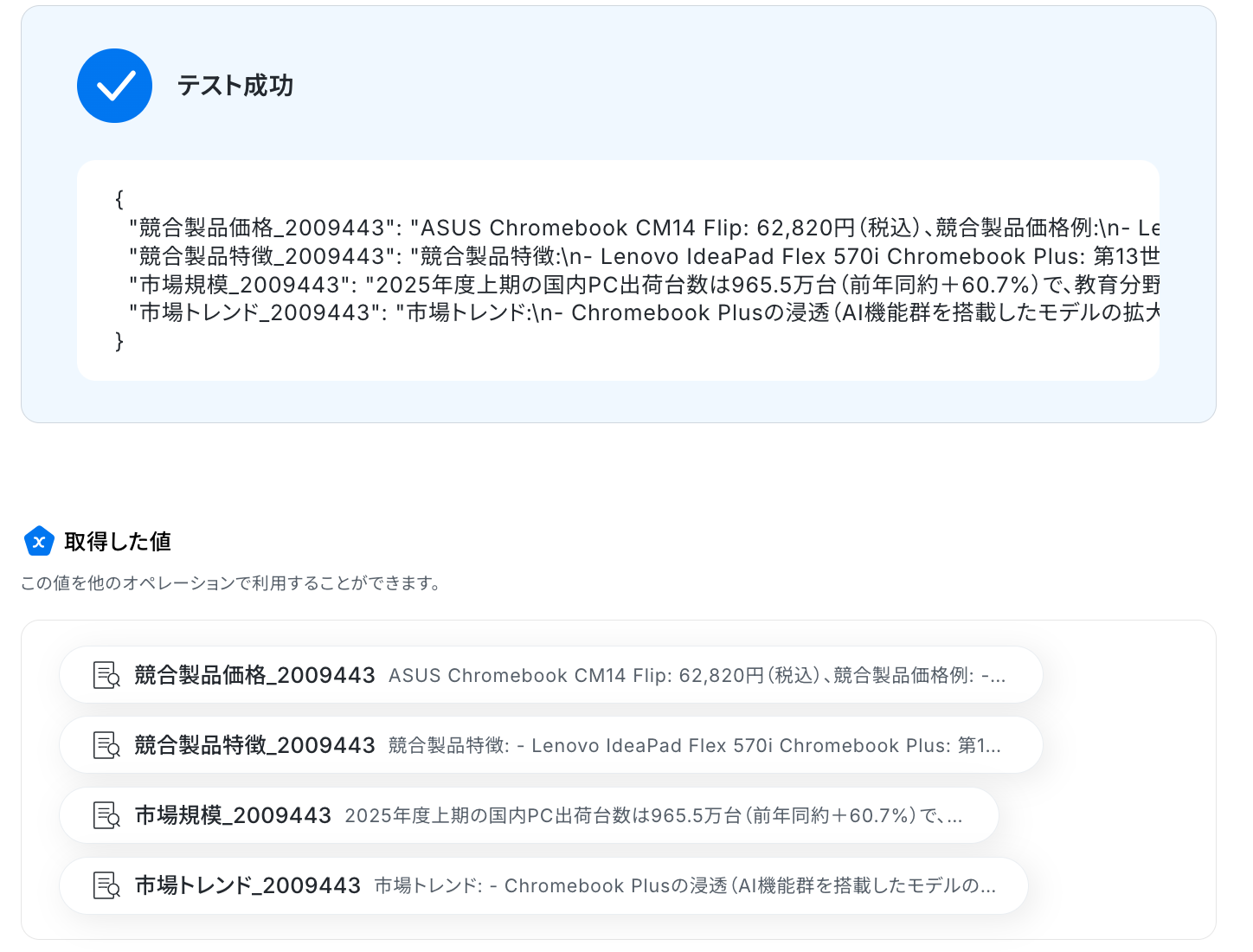 テストに成功すると取得した値が表示されます。