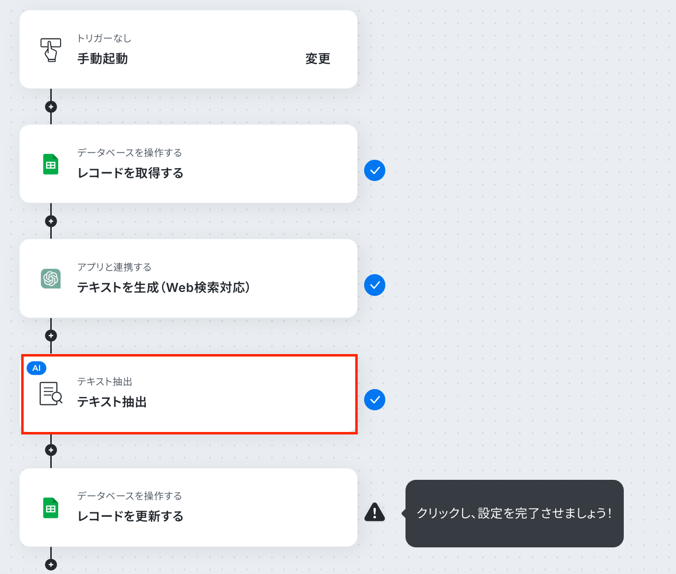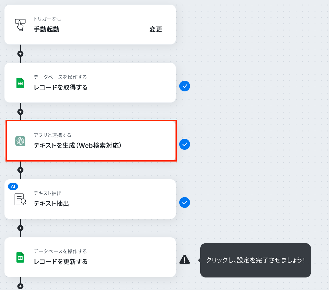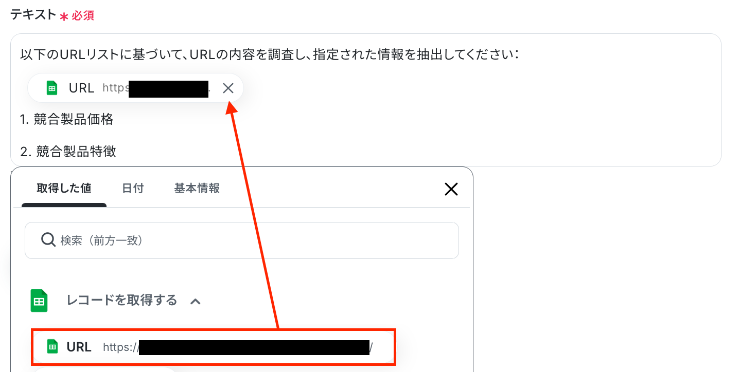 Google スプレッドシートの各アクションでは、対象となる任意のスプレッドシートIDとスプレッドシートのタブ名を設定してください。 ChatGPTの「テキストを生成」アクションでは、Web検索させたい内容や取得したい項目を指示するプロンプトを任意の内容に設定してください。 テキスト抽出のアクションでは、ChatGPTが生成した文章から抜き出したい項目を任意で設定してください。 ■注意事項