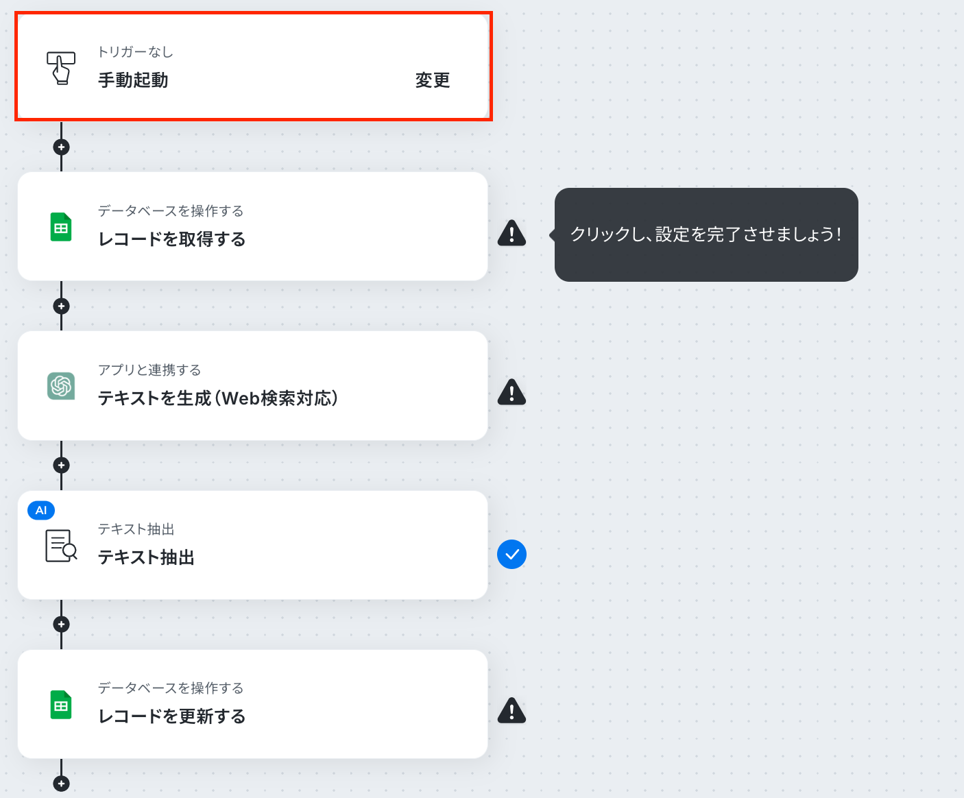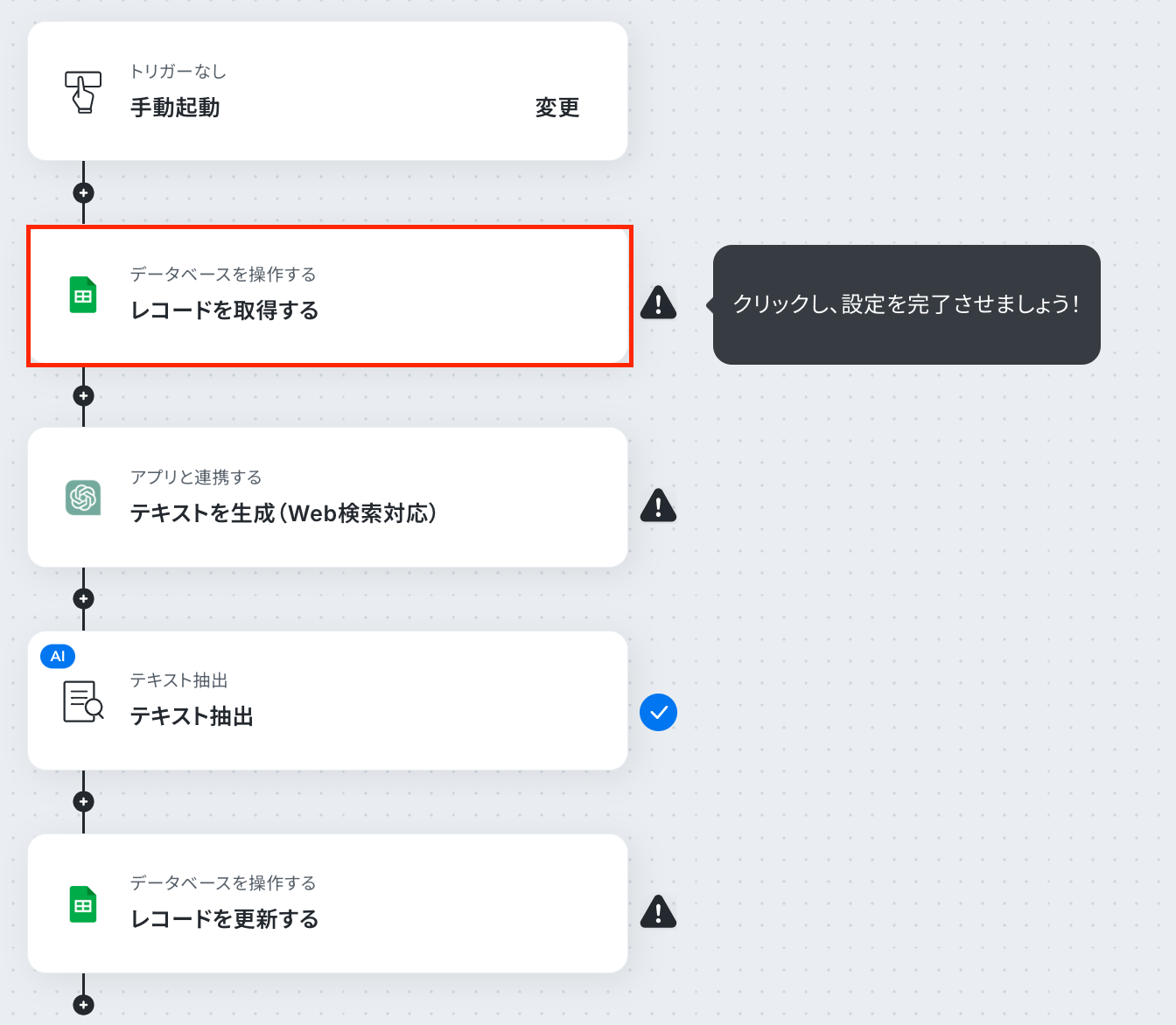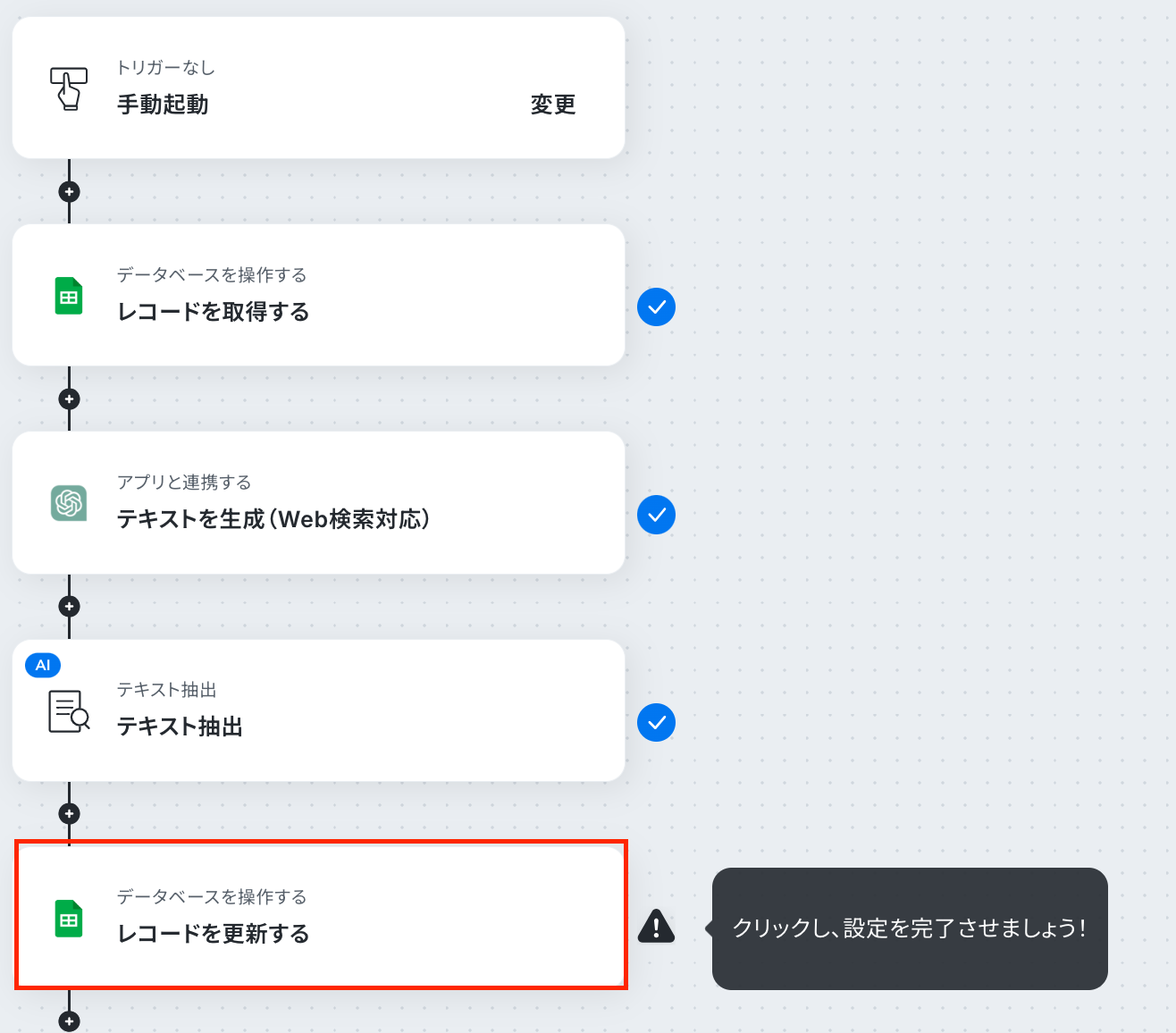 Google スプレッドシートの各アクションでは、対象となる任意のスプレッドシートIDとスプレッドシートのタブ名を設定してください。 ChatGPTの「テキストを生成」アクションでは、Web検索させたい内容や取得したい項目を指示するプロンプトを任意の内容に設定してください。 テキスト抽出のアクションでは、ChatGPTが生成した文章から抜き出したい項目を任意で設定してください。 ■注意事項