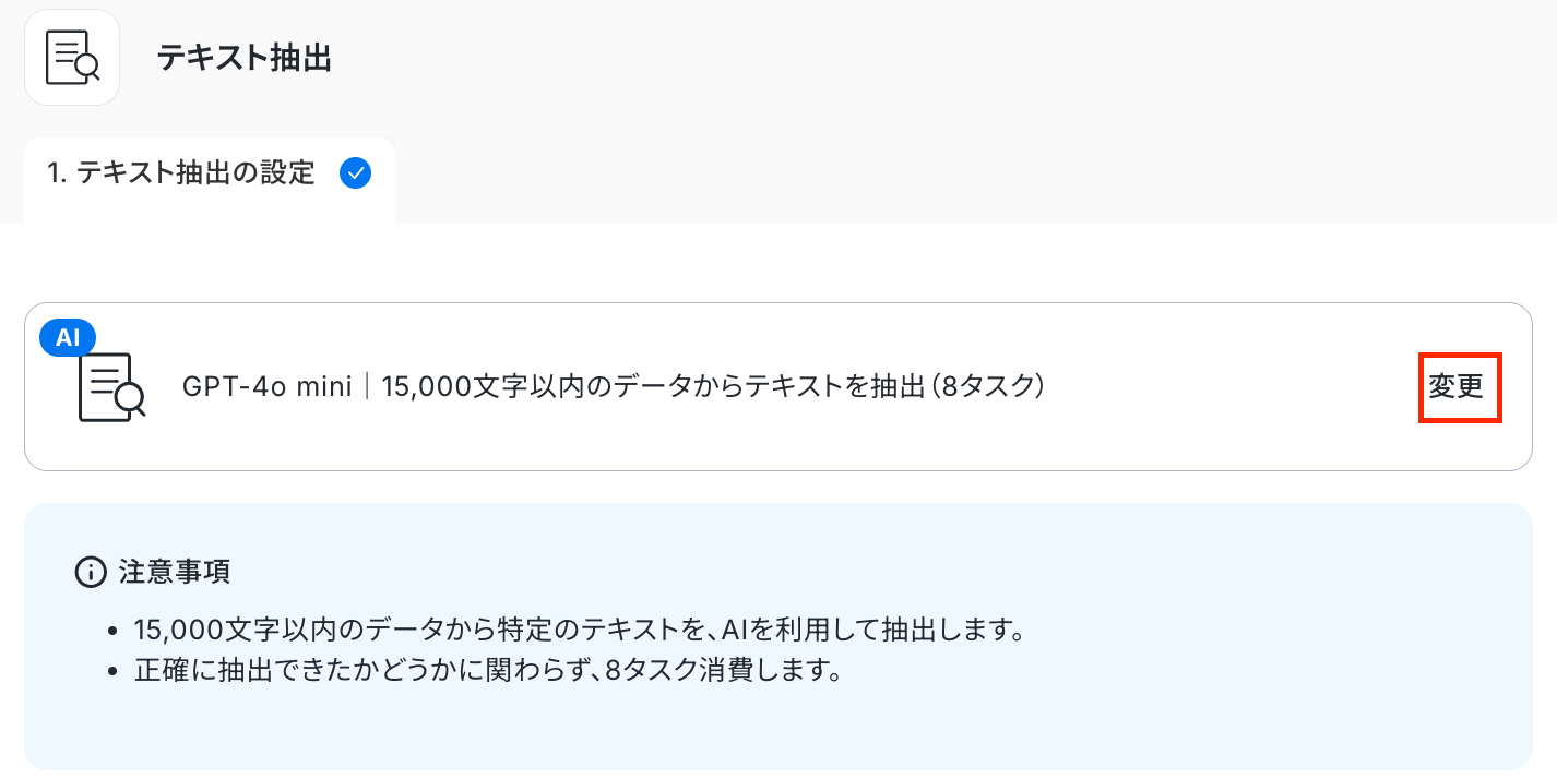 以下の画面が表示されるので、注意事項を確認しましょう。 赤枠部分の「変更」をクリックして、設定を変更することが可能です。 消費するタスク数が異なるのでご注意ください。