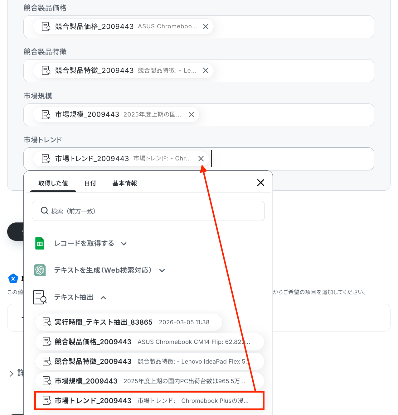 【Tips】 取得した値を活用することで、フローボットを起動する度に変動する値として反映されます。 これにより、毎回変動する情報を手動で入力する必要がなくなり、効率的に連携できます!