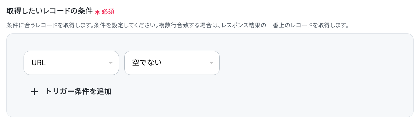 次の画面に移動したら、「取得したいレコードの条件」 を設定します。 「URL」が「空でない」レコードを取得するよう設定しましょう。