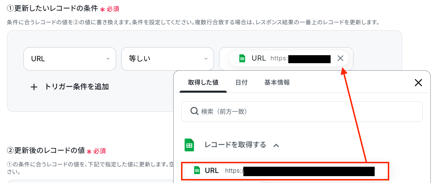 次の画面で、「更新したいレコードの条件」 を設定してください。 ここで指定した条件に合致した場合のみ、レコードの更新を行います。 「URL」が、Google スプレッドシートのオペレーションで取得した「URL」と等しい場合に更新するよう設定しましょう。