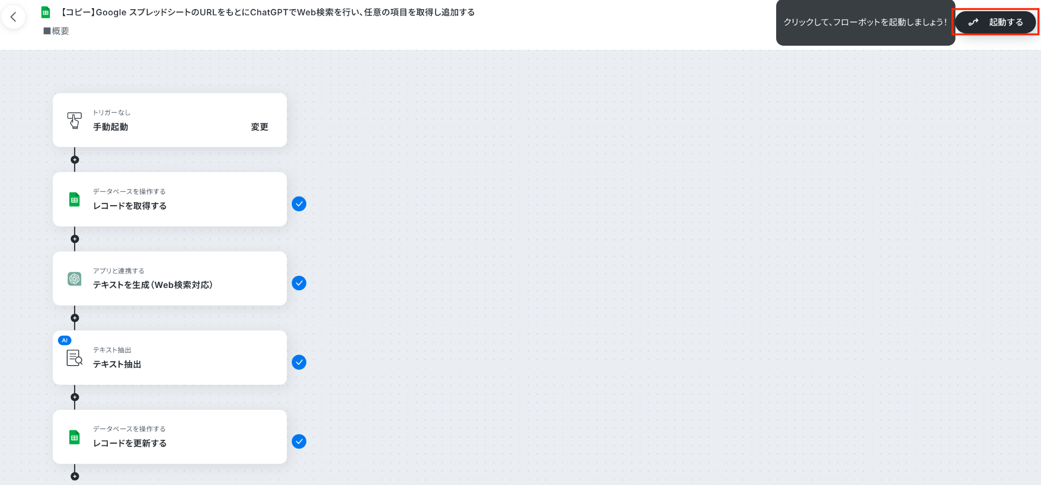 すべての設定を完了させると、フローボットの画面右上に「起動する」ボタンが表示されます。 フローを起動したい際に、フローボットを手動で起動させてください。