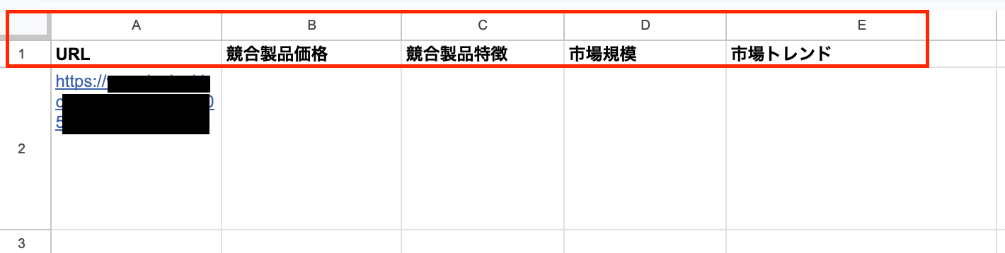 前準備:Google スプレッドシートを用意する 今回のフローでは、Google スプレッドシートでURLリストを管理し、URLをもとにChatGPTでweb検索を行い、レコードを更新する方法を解説します。 そのため「URL」 の列と任意の項目 を設定してください。