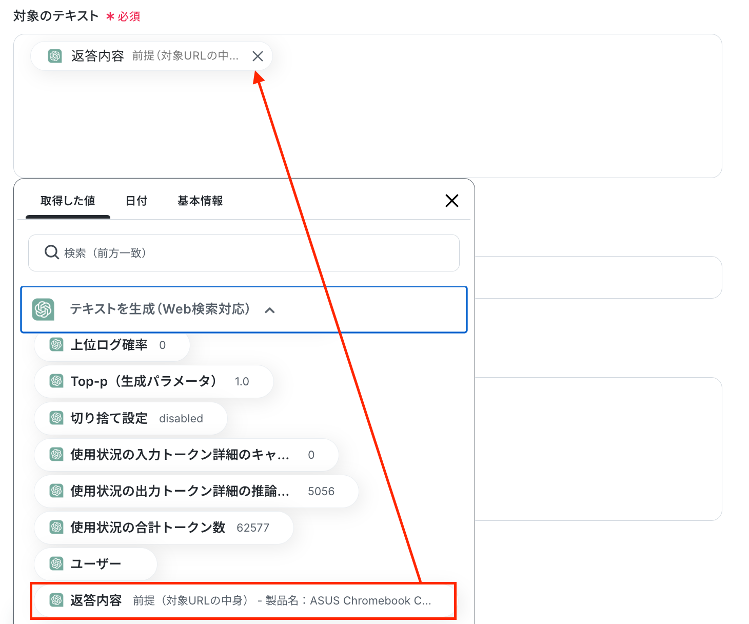 「対象のテキスト」 は、ChatGPTのオペレーションで取得した値から設定してください。