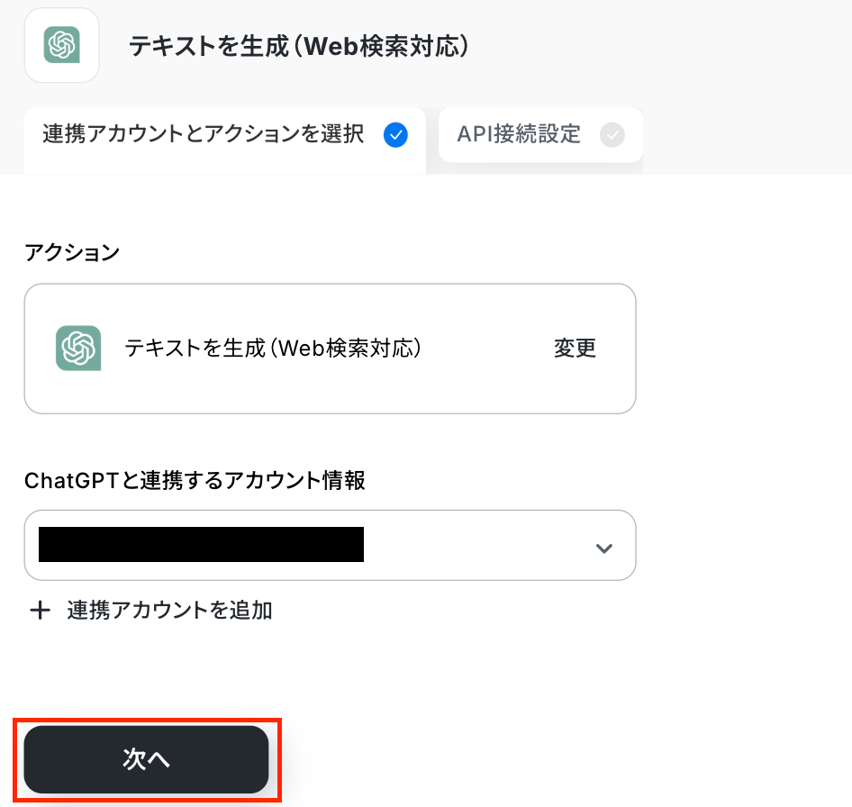 アクションはそのままで、連携するアカウントを確認します。 「次へ」をクリックしましょう!