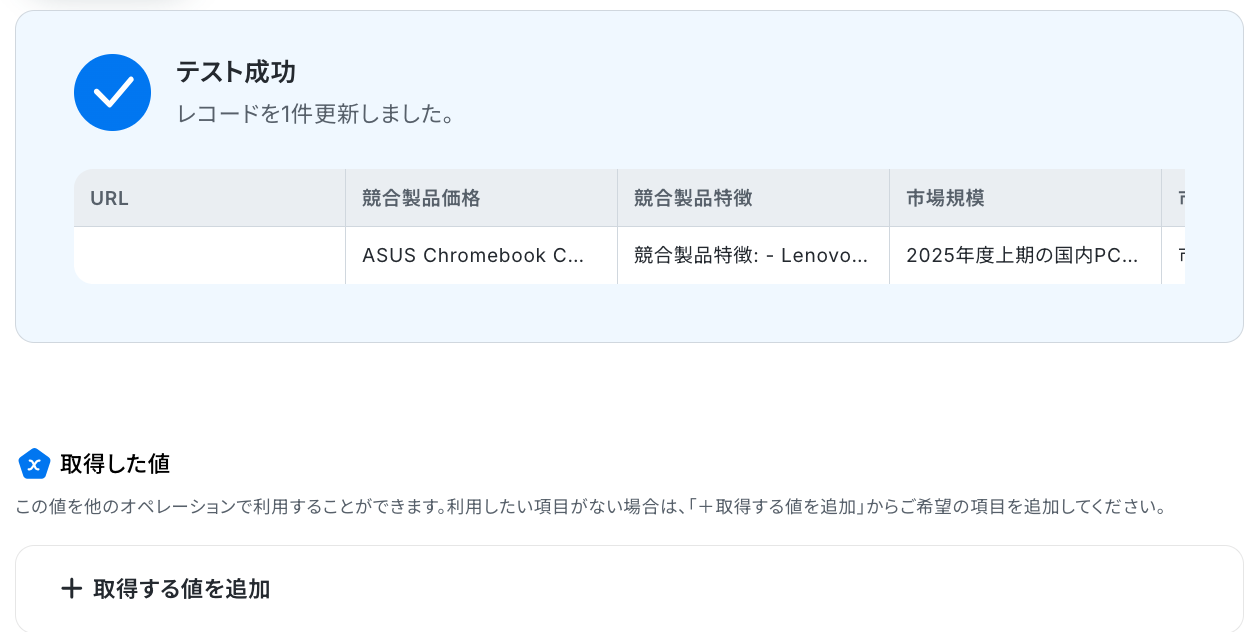 「更新したいレコードの値」 では、更新したい箇所のみ設定していきましょう! テキスト抽出のオペレーションで取得した値から選択して設定してください。