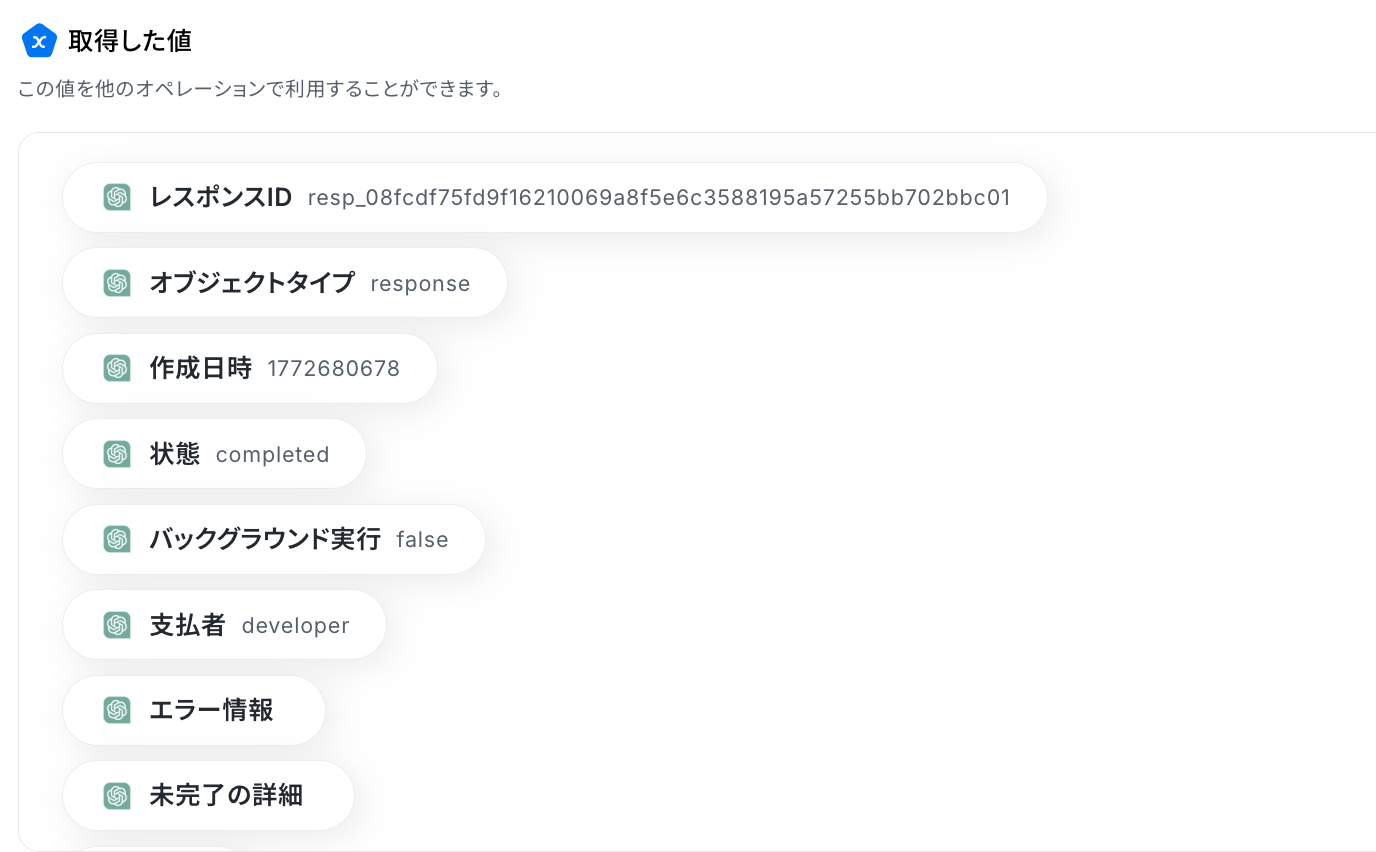 ※ 取得した値 とは? トリガーやオペレーション設定時に、「テスト」を実行して取得した値のことを指します。 後続のオペレーション設定時の値として利用でき、フローボットを起動する度に変動した値となります。