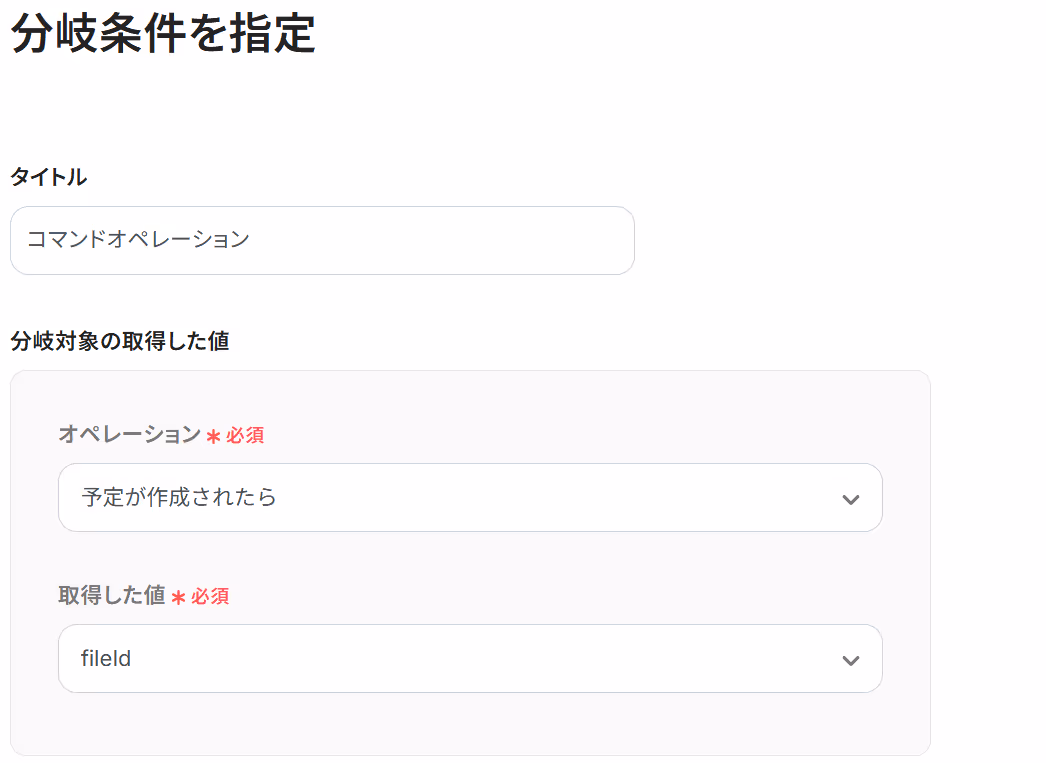 オペレーションは「予定が作成されたら」、取得した値は「fileId」のままで大丈夫です。