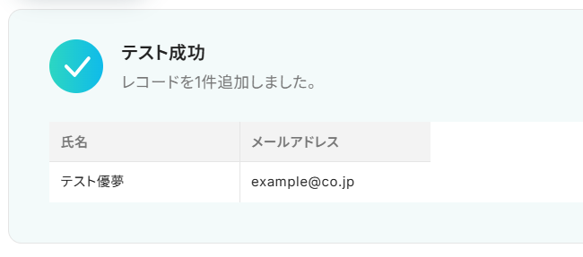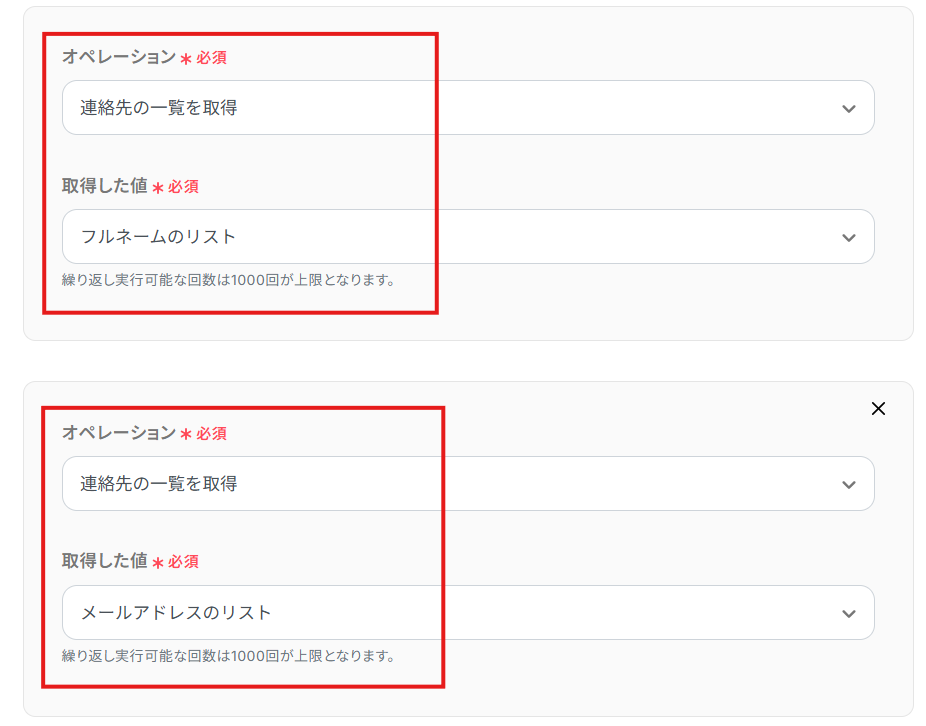 繰り返し処理の設定を行うことで、Googleコンタクトから連絡先一覧の情報を得た際に、「繰り返し対象の取得した値」で設定した値に応じて、順番に自動で複数人全ての連絡先を追加できるようになります。