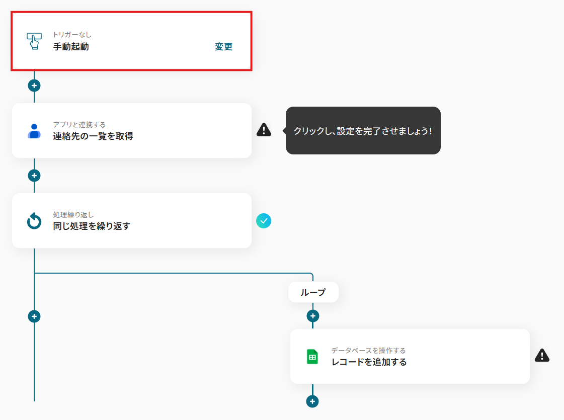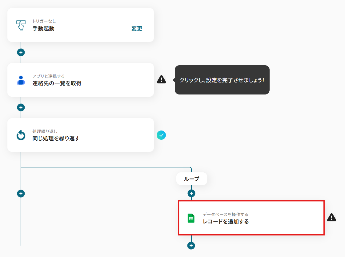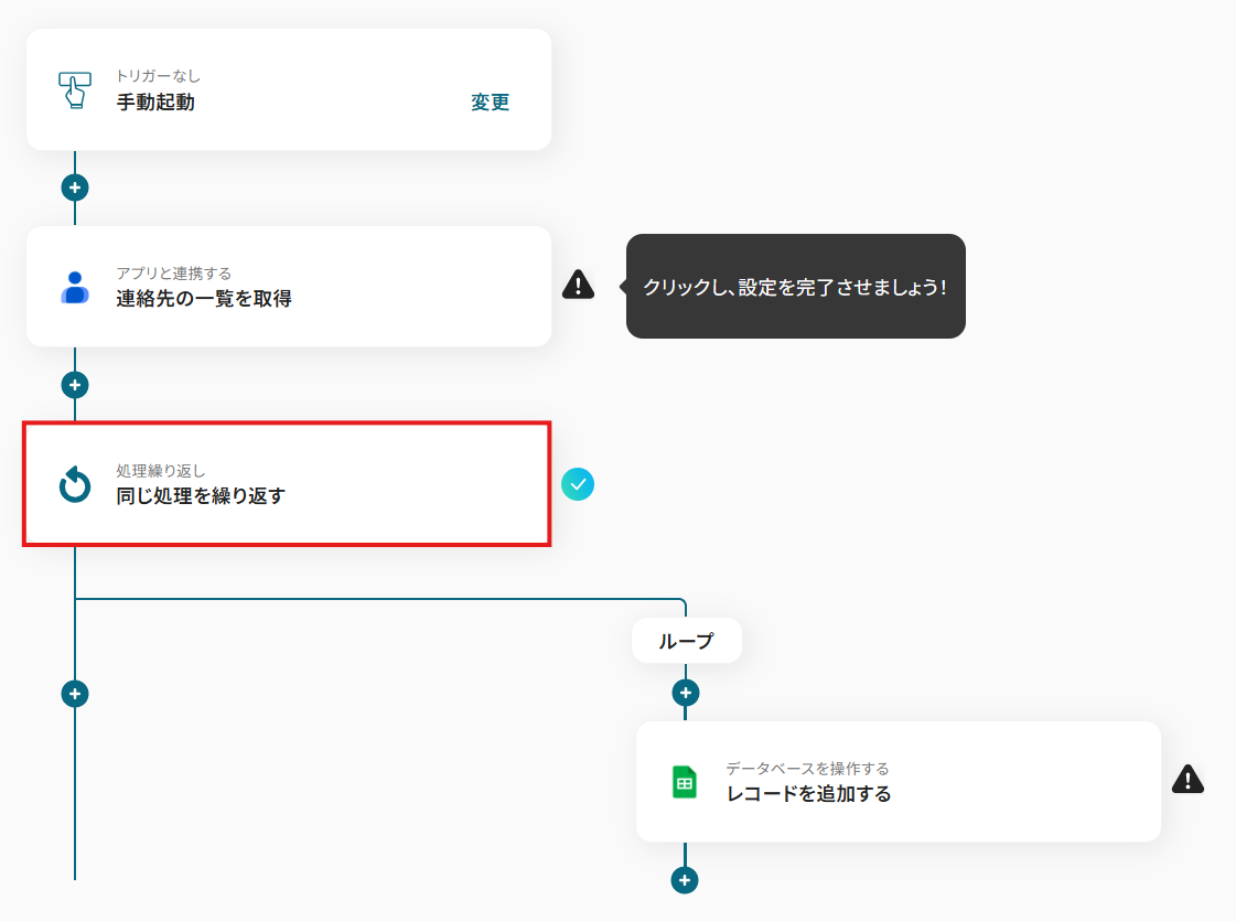 ここでは、繰り返しでGoogle スプレッドシートに連絡先の一覧追加を行うための設定を行います。