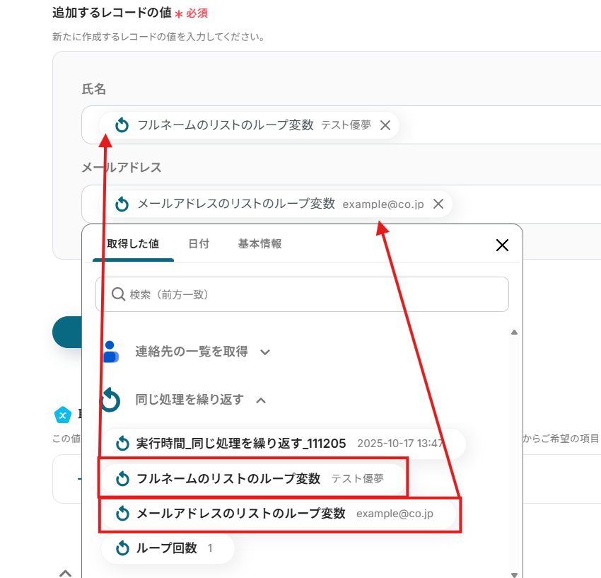 「追加するレコードの値」の各項目は、入力欄をクリックして表示される取得した値から選択してください。