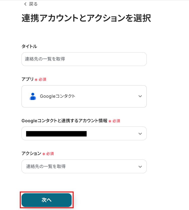 連携するアカウント情報には、ステップ1で連携したアカウント情報が反映されています。アクションはそのままにして、「次へ」をクリックしてください。