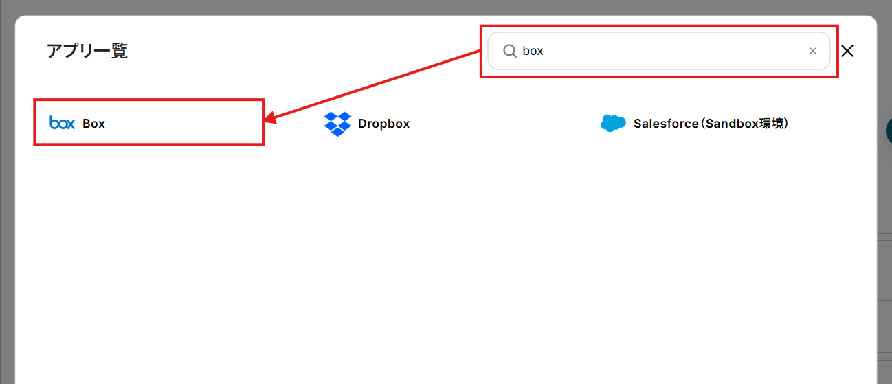 次はBoxを連携していきましょう。 「アプリ一覧」でBoxを検索して選択。