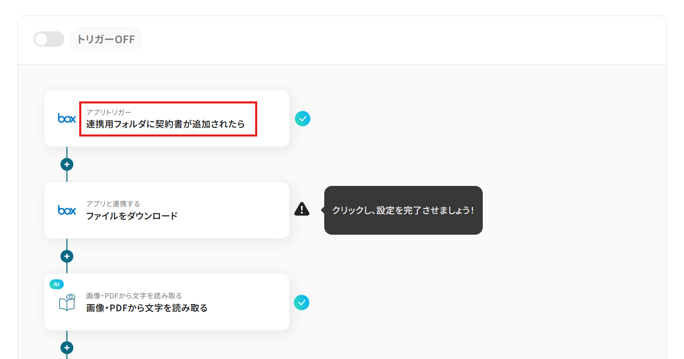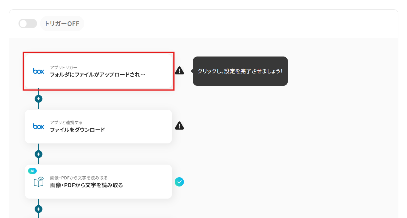 トリガーとなるフォルダと各アクション(OCR・抽出・通知)の設定
