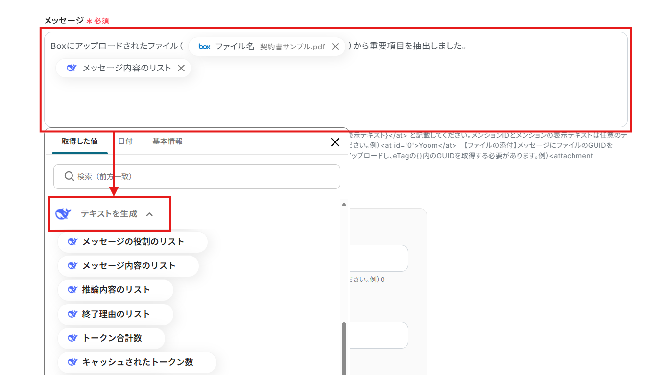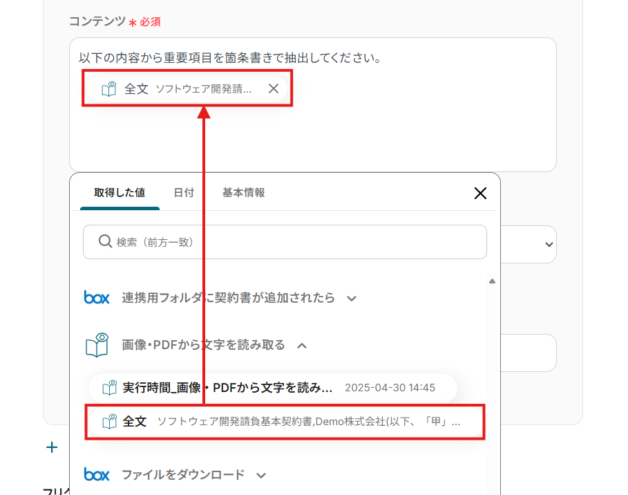 「コンテンツ」にステップ5で抽出したテキストと、重要項目の抽出にあたってのプロンプトを設定。 入力欄クリック時に表示される「取得した値」の「画像・PDFから文字を読み取る」メニューから、任意の抽出したい項目を選択してください。 ※ タイトルを変更している場合は変更後のタイトルで表示されます。 選択した項目は赤枠のように表示されます。