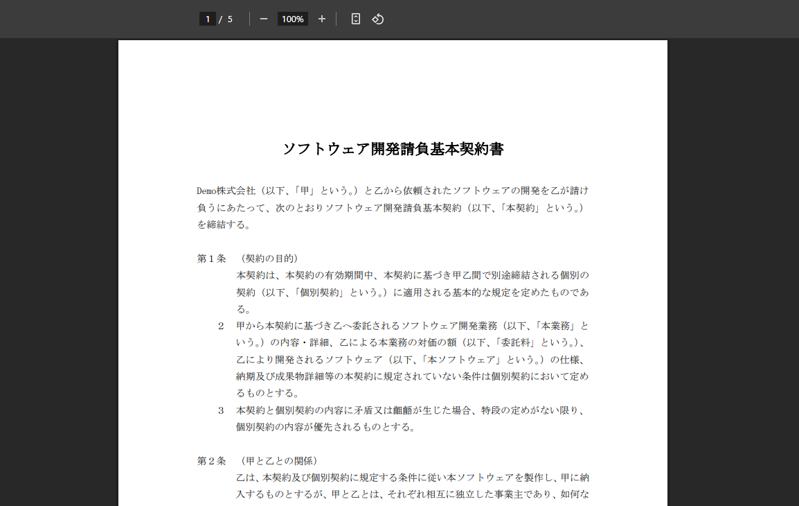 テスト用に、要約したいPDFファイル(もしくは画像ファイル)をご用意ください。 ここでは例として、下図の契約書を使用します。