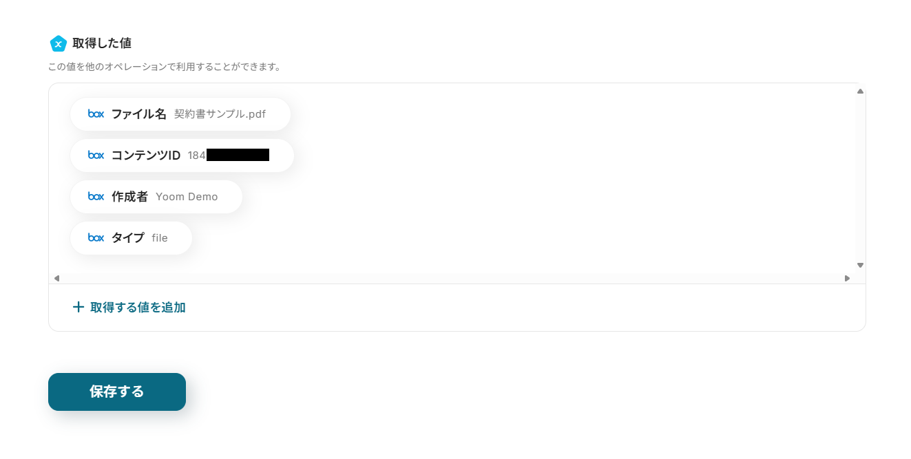 テストに成功すると、「取得した値」にファイルの情報が追加されます。