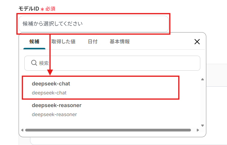 「モデルID」の入力欄をクリックし、表示される候補から抽出に使用するモデルを選択。DeepSeekのAPIガイド も合わせてご参照ください。