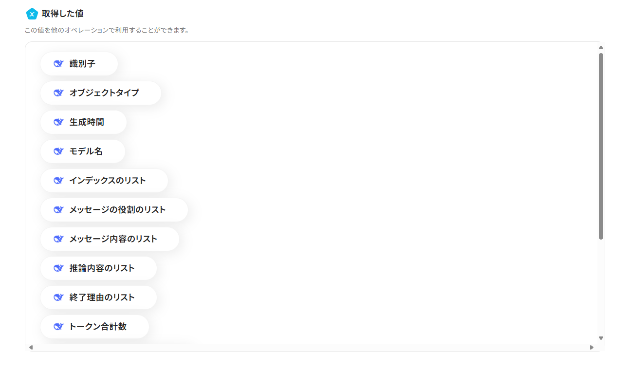 テストに成功すると、「抽出したい項目」に設定した項目の値がファイルから抽出され、「取得した値」に追加されます。 ※ 期待する値が抽出されていない場合には、「使用するAI」を変更して再度お試しください。