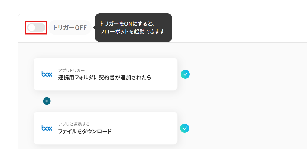 フロー画面に戻り、「全ての設定が完了しました!」と表示されていればフローの設定は完了です。 早速フローを稼働させる場合、「トリガーをON」をクリックします。
