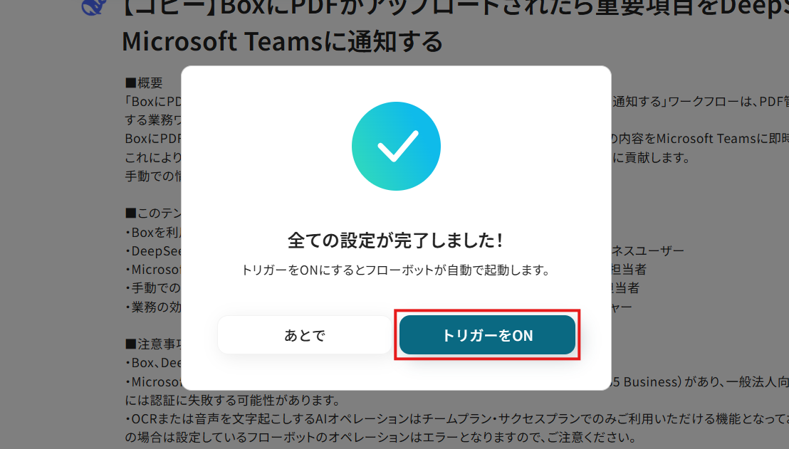 ■概要 「BoxにPDFがアップロードされたら重要項目をDeepSeekで抽出し、Microsoft Teamsに通知する」ワークフローは、PDF管理と情報共有の効率化を実現する業務ワークフローです。 BoxにPDFファイルをアップロードすると、自動的にDeepSeekが重要な情報を抽出し、その内容をMicrosoft Teamsに即時通知します。 これにより、チーム全体で必要な情報を迅速に共有でき、業務のスピードアップと精度向上に貢献します。 手動での情報整理や共有の手間を省き、よりスマートな業務運営をサポートします。 ■このテンプレートをおすすめする方 ・Boxを利用して多くのPDFファイルを管理しているが、情報抽出に時間がかかっている方 ・DeepSeekを活用して効率的にデータを抽出し、チーム内で共有したいと考えているビジネスユーザー ・Microsoft Teamsを日常的に使用しており、自動通知で業務の連携を強化したい企業の担当者 ・手動でのデータ整理や共有作業を減らし、業務プロセスを自動化したいと考えているIT担当者 ・業務の効率化と情報共有の迅速化を図り、チーム全体の生産性を向上させたいマネージャー ■注意事項 ・Box、DeepSeek、Microsoft TeamsのそれぞれとYoomを連携してください。 ・Microsoft365(旧Office365)には、家庭向けプランと一般法人向けプラン(Microsoft365 Business)があり、一般法人向けプランに加入していない場合には認証に失敗する可能性があります。 ・OCRまたは音声を文字起こしするAIオペレーションはチームプラン・サクセスプランでのみご利用いただける機能となっております。フリープラン・ミニプランの場合は設定しているフローボットのオペレーションはエラーとなりますので、ご注意ください。 ・チームプランやサクセスプランなどの有料プランは、2週間の無料トライアルを行うことが可能です。無料トライアル中には制限対象のアプリやAI機能(オペレーション)を使用することができます。
