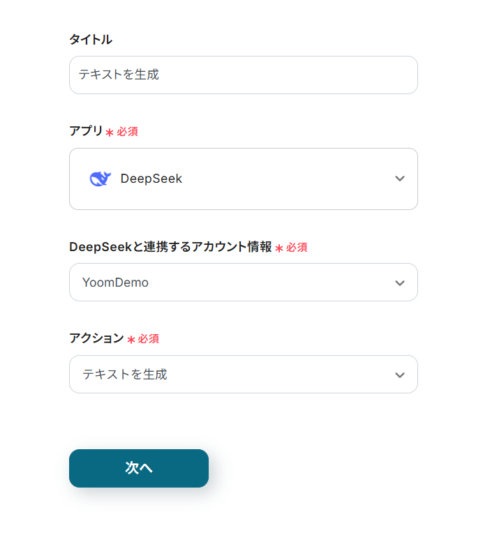 タイトルと連携するアカウント情報を任意で設定し、アクションはテンプレート通りのまま「次へ」をクリックして進んでください。