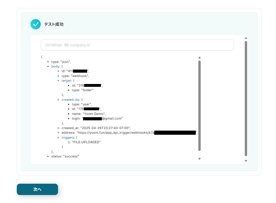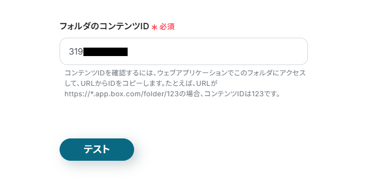 「フォルダのコンテンツID」にトリガーとして設定したいフォルダのコンテンツIDを設定。 コンテンツIDはBoxの対象フォルダURL(folder/{{ID部分}}/)で確認できます。 ※Yoomですでに使っているフォルダを指定するとテストでエラーになるので、その場合は新規フォルダを作成しましょう。